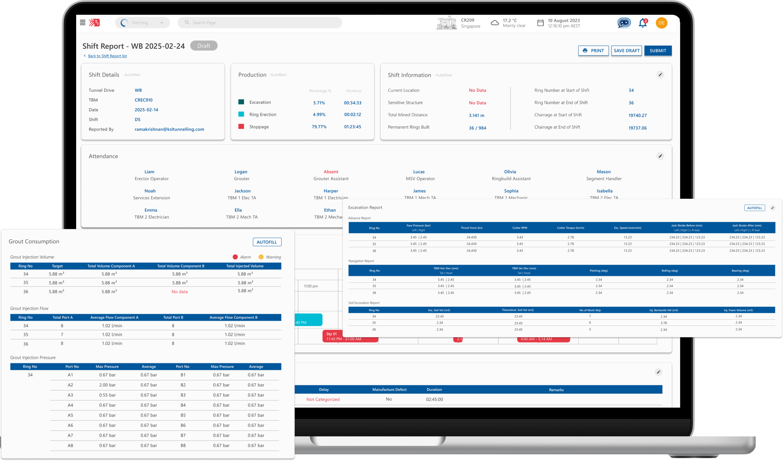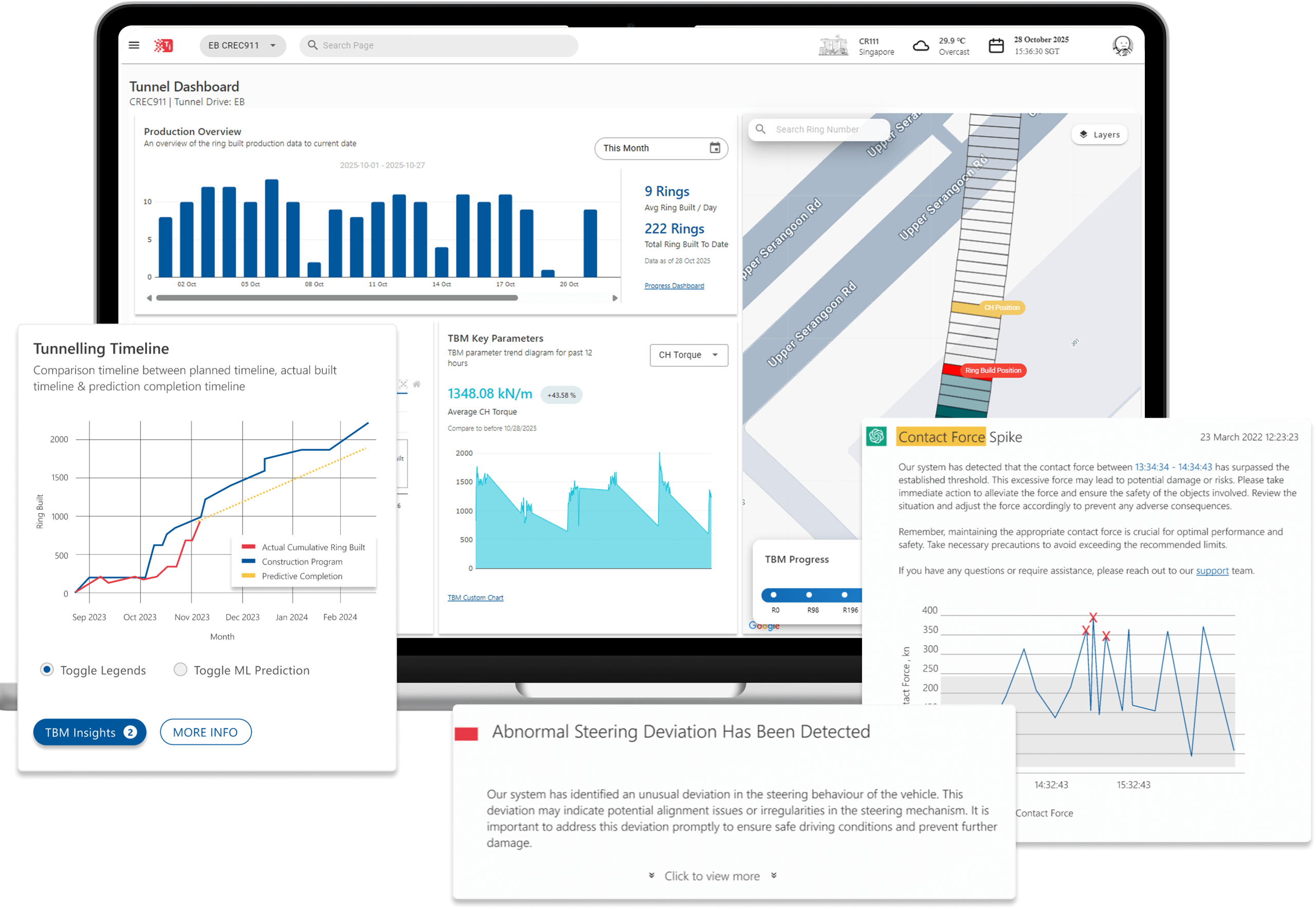 Tunnel Insight brings clarity and accountability to tunnelling projects. Built for environments where visibility is limited and accountability is critical, it transforms raw TBM data into reliable reports, dashboards, and insights.